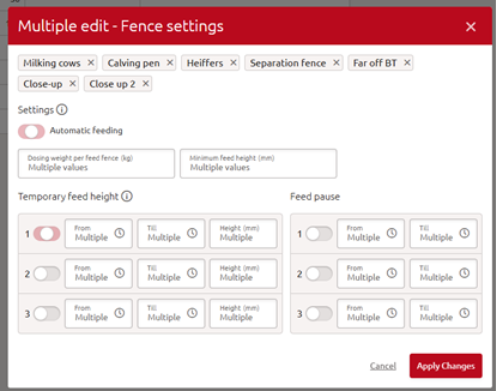 Quick Batch Entries: The new fence page emphasizes batch entries, allowing users to make quick changes to multiple fences simultaneously. By selecting the desired fences via checkboxes, users can easily adjust dosing weights, feed heights, and temporary settings like feed pauses and temporary feed heights.